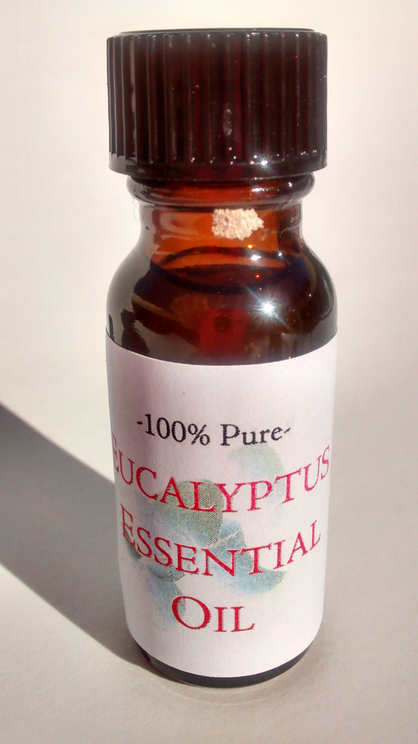 This is 100% pure, undiluted eucalyptus essential oil packaged in a .5 fl. oz. amber glass bottle. For external use only.